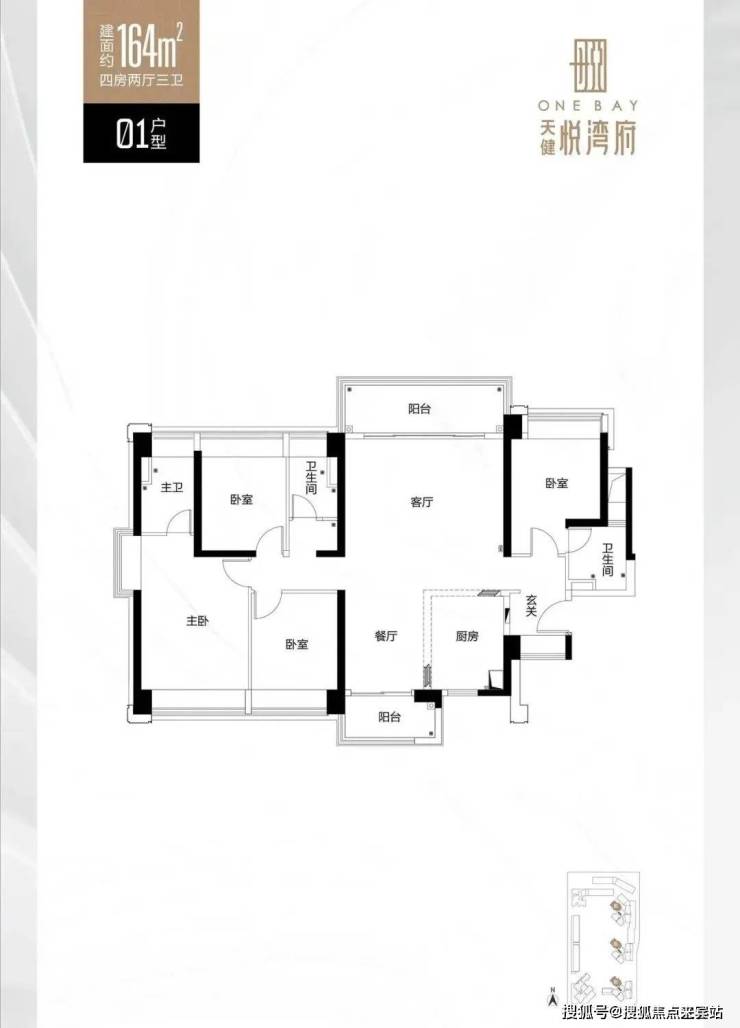 ▲01户型面积约为164㎡的4房2厅3卫,西南朝向。该户型为大横厅设计,户型方正,南北通透。值得一提的是,主卧和次卧之间没有承重墙,可以打通成大房。另外,该户型皆可以看到整个园林。