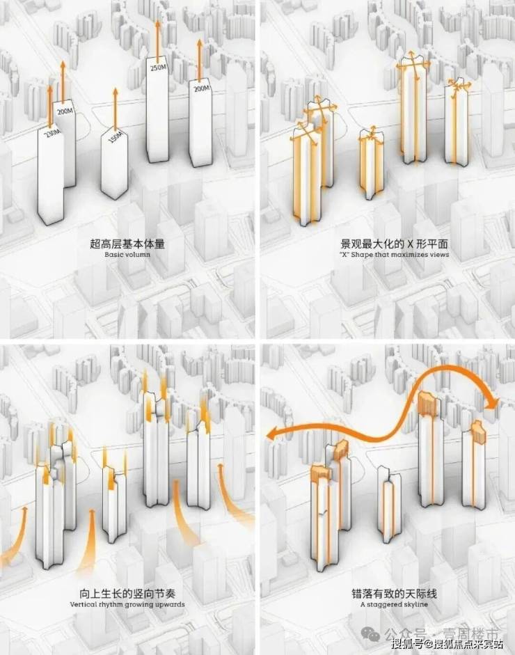结合场地景观资源条件,团队提出一个反同质化的“X”形平面,作为住宅及公寓塔楼的平面原型。