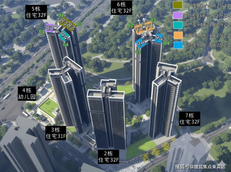 :总高 30-32 层,2 梯 3 户 / 2 梯 4 户,梯户比优化,私密性与通勤效率兼顾。