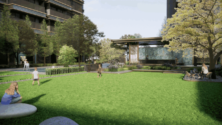 公共空间,包括中央绿岛、儿童FUN享乐园、草坪剧场、有氧跑径、主题架空层等,绿意盎然,老少各得其乐。