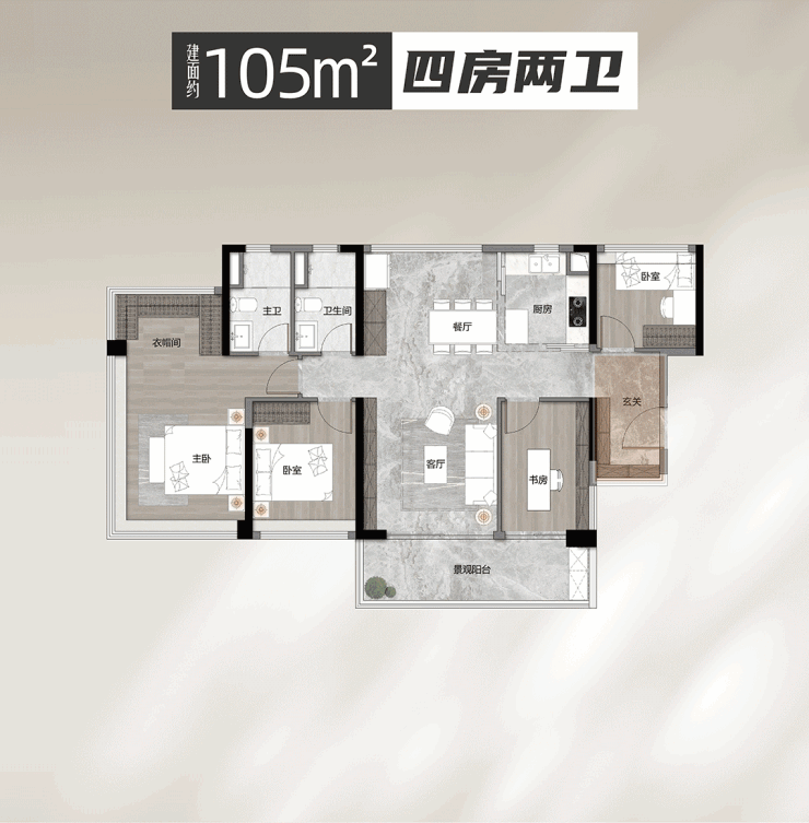 建面约105平四房,单边户南北通透,105平单边户户型,做出南北通透四房,三代同堂家庭都能一步到位。