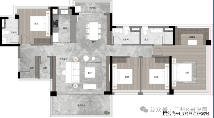 建面约123平四房,卧室都可放下1.8米大床,体验感相当于144平大宅,品质感更高。