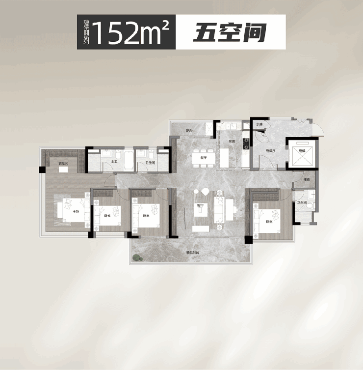 建面约152平5空间,比肩200平大平层享受,152平户型,更是buff叠满,项目唯一的14层板楼小高层产品,主打就是豪宅感。