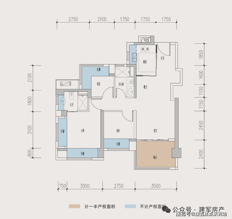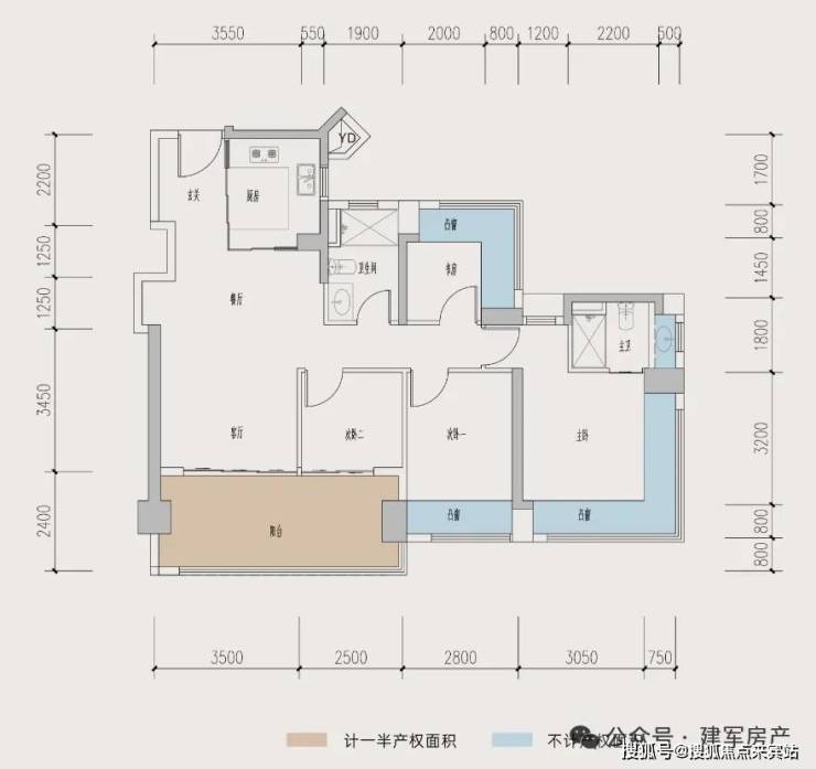 87㎡的3房2厅2卫,B户型,设计的是经典竖厅格局,进门入户玄关,客厅3.5米开间,LDKB一体化,动静分区,三开间朝南,S墙设计预留冰箱卡槽位,主卧+1个次卧270°飘窗,U型厨房,卫生间干湿分离,得房率约:77.4%(不含赠送),西南朝向。套内面积67.51㎡+赠送面积16.96㎡=实得84.47㎡,加上赠送得房率96.83%。