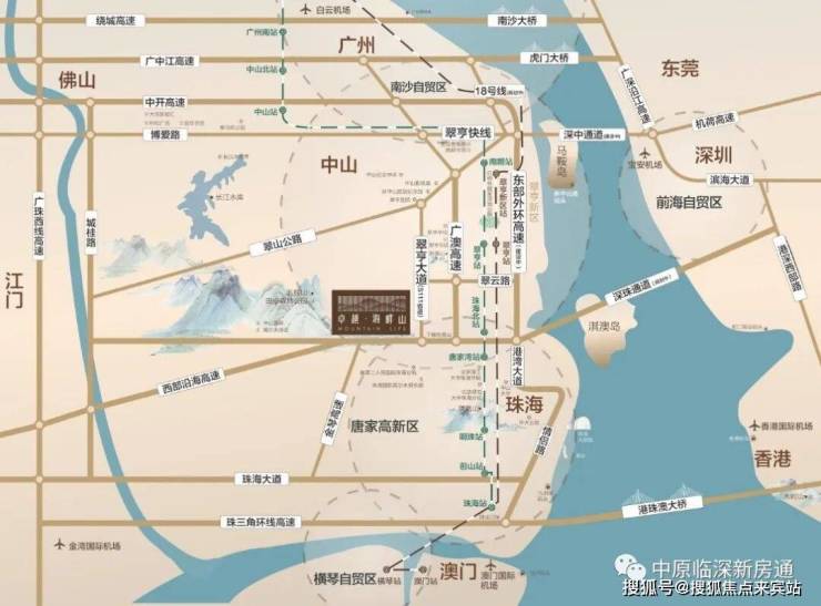 15分钟对接深中通道(建设中)、衔接港珠澳大桥,望前海、邻珠海;深珠通道(规划中)连接深珠一线;五大机场,两大轻轨、四条快线贯穿中珠双城,坐享双城融合之势;四条高速接驳深中通道,瞬达深圳各区。中山港新码头接驳海上交通,一小时抵达深港澳,翠亨轻轨站、广州18号地铁延长线翠亨站,北通广州,南通珠海、澳门。