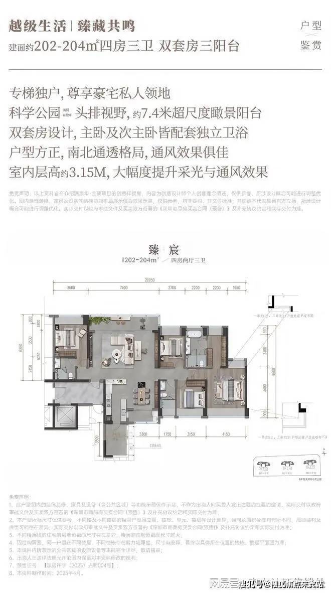 204㎡的4房2厅3卫,设计的是横厅南北通透格局,独立专梯入户,客餐厅7.4米开间,LDKB一体化,超大客厅+双套房设计,4个卧室分别做到了主卧33㎡/次卧16.1㎡/次卧13.54㎡/次卧11.61㎡(包含墙体飘窗),客餐厅出7.4米长的观景大阳台,直面科学公园,L型厨房带1个生活阳台,卫生间干湿分离,东北朝向。