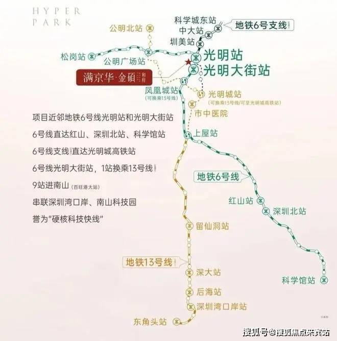 周边分布有地铁6号线的光明、科学公园站,距离约1公里左右,两站可换乘13号线,规划有另一条直达南山科技园的29号线,轨道交通便利。