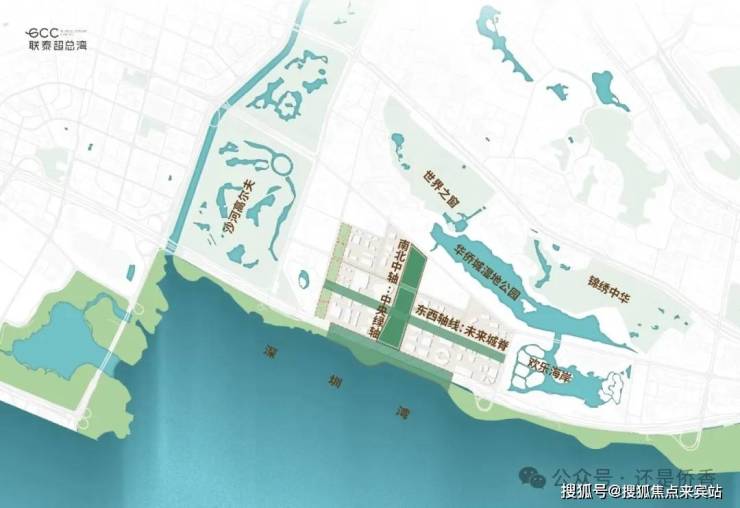 深超总采用院士总控制,由孟建民院士领衔总设计师团队,汇聚全球顶尖设计力量。其核心创新是"一心双核,十字生境"的空间结构,以中央绿轴为南北轴线,连接塘朗山与深圳湾,形成"通山达海"的生态廊道。