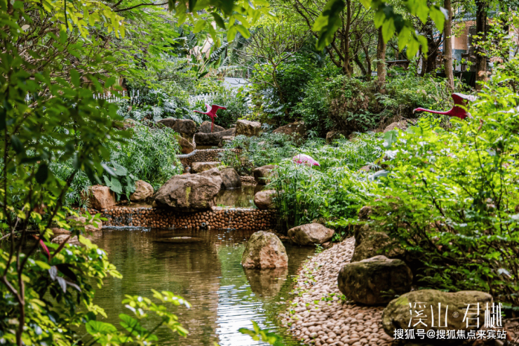 项目内部打造了一条沿着台地蜿蜒的溪流,该水系为市面罕见的活水溪流,贯穿整个社区园林,依据溪岸的曲直不同和地形变化,打造叠水、溪流、瀑布、水潭等多样特色水景,溪岸植物种类繁多,与水流互为风景,沿岸专门设置不同的亲水平台,营造自然灵动的栖心之境。
