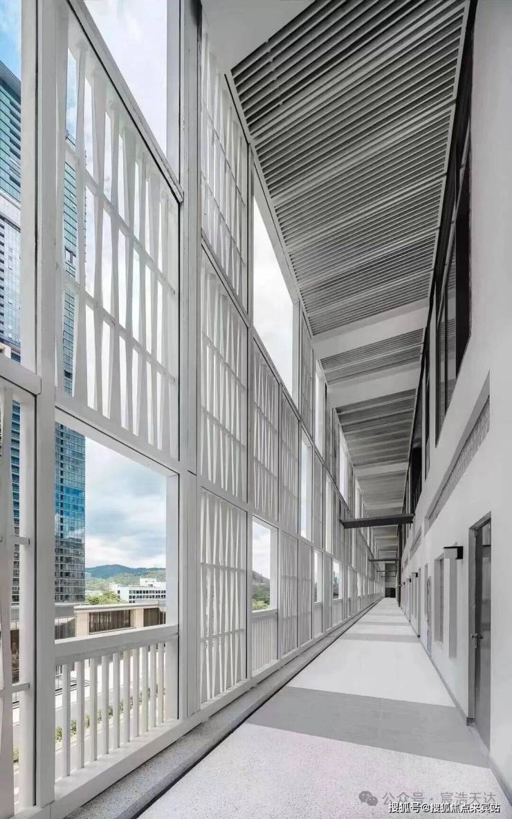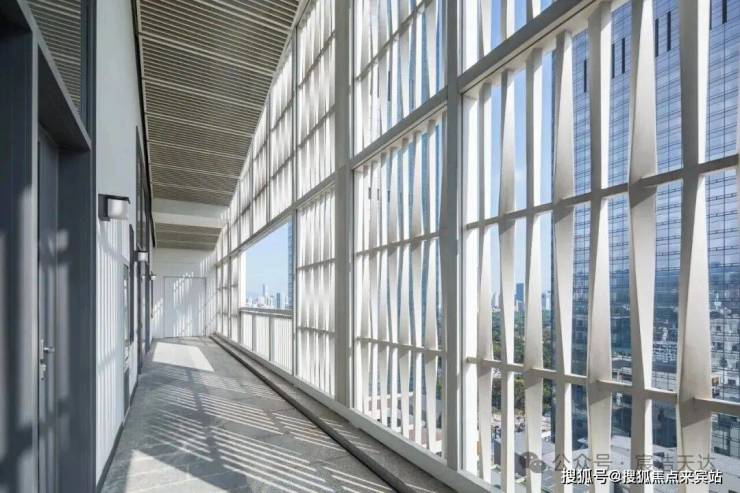 体量竖向叠加,植入前后双廊,即保证南北通透,又营造出兼具开放与私密性的邻里空间。站在廊外,穿过由UHPC(超高性能混凝土)材料制成的螺旋形格栅幕墙,还可一览深圳著名网红打卡地——深业上城小镇街区。