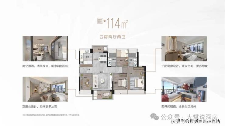 约114㎡奢阔四房,满足三代同堂,南北双阳台,室内空气清新对流居住更舒适,宽敞客厅成为会客宴请主场;主卧套房,独立卫浴便捷生活动线,生活更加自由随心