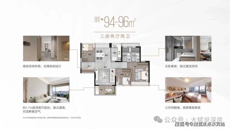约94-96㎡阳光三房,多开间朝阳让空间充满阳光,突破传统阳台进深标准,约1.7米进深景观阳台,拓宽采光及视野,将风景引入生活,为生活增添了鲜艳底色