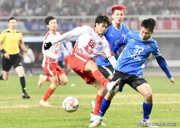 12月20日晚,长沙贺龙体育场,双方球员在比赛中激烈拼抢。当天,湘超联赛半决赛开赛,“实力之王”长沙队(红)主场迎战“流量之王”永州队,在90分钟激烈的比赛后,两队带着2:2的比分进入了关键的点球大战。