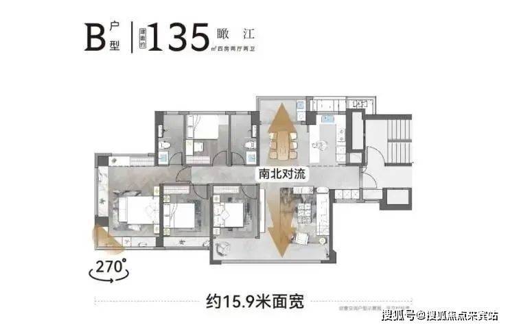 这个户型也是四开间朝南,南向面宽达到15.8米,设计非常能打。