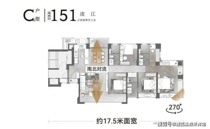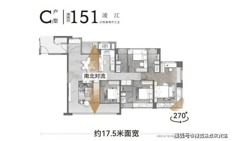 这个户型设计为4.5开间朝南,南向面宽超过17米,也是南北对流双阳台,景观阳台连通次卧。