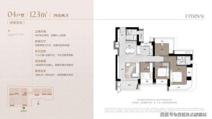 户型采用新规设计,通过弹性方厅、多飘窗等实现90%+使用率