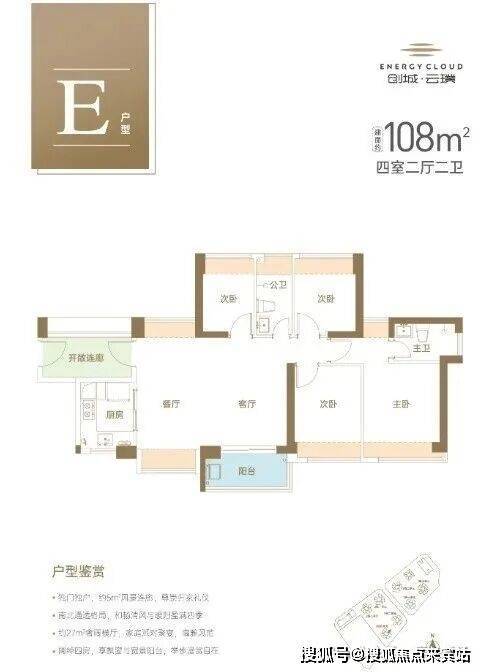 108m²的4房2厅2卫,仅2栋4单元03户型才有,进门赠送5.34m²的入户玄关,设计的是横厅南北通透格局,客餐厅5.9米开间,全屋8面飘窗,分别做到了主卧13.73m²/次卧9.53m²/次卧7.47m²/次卧5.75m²(包含墙体飘窗),U型厨房,卫生间干湿分离,得房率74.4%(不加赠送),套内面积80.32m²,阳台东南朝向。