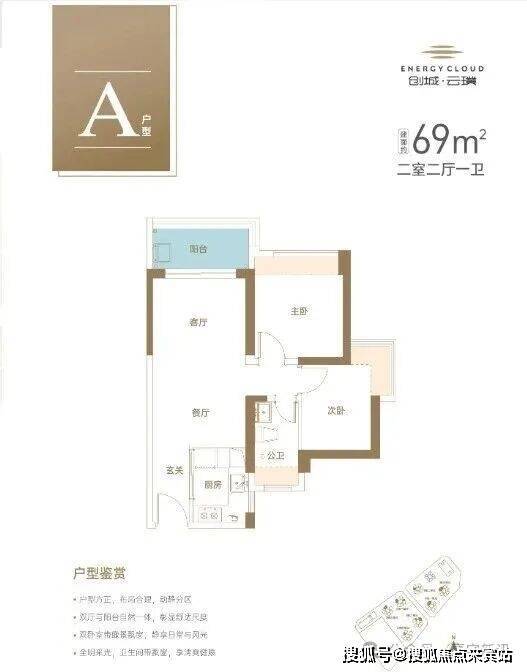 69㎡的2房2厅1卫,设计的是竖厅格局,客厅3.3米开间,LDKB一体化设计,2个卧室分别做到了主卧9.76㎡/次卧7.77㎡(实测面积,去掉墙体),U型厨房,卫生间干湿分离,得房率约74.4%(不含赠送),套内面积51.04m²,西北/东北或东南朝向。