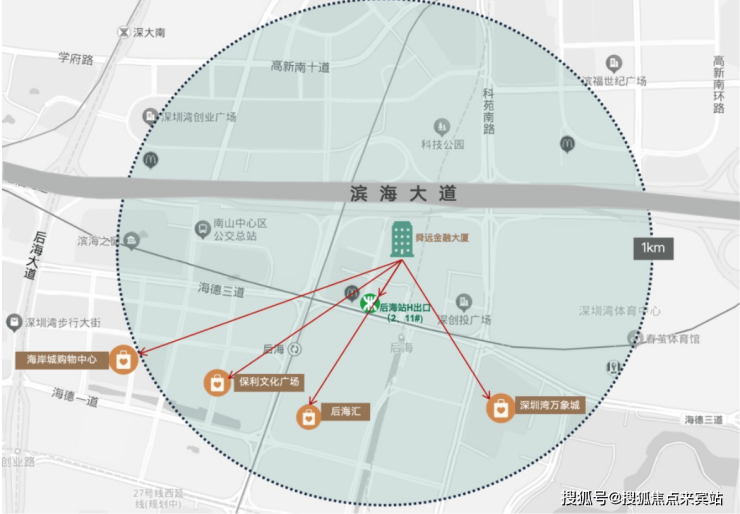 周边商业配套:共享卓越intown、航天科技裙楼商业,1公里直径内辐射深圳湾万象城、海岸城购物中心、保利文化广场、后海汇4大核心商圈