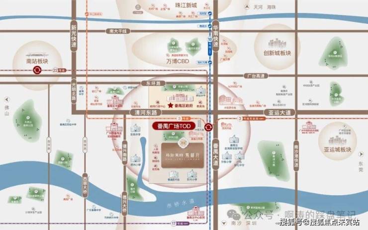 广州惟一双高速地铁区域。项目距离地铁番禺广场站约 900 米距离,囊括3号线、3号线东延段(在建中),已开通的广州地铁 3 号线、18 号线、22 号线,未来规划有广州地铁 17 号线,5 轨汇聚于此,如此便捷的交通路网是其他板块难以比拟。