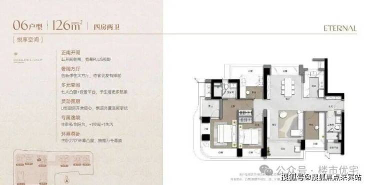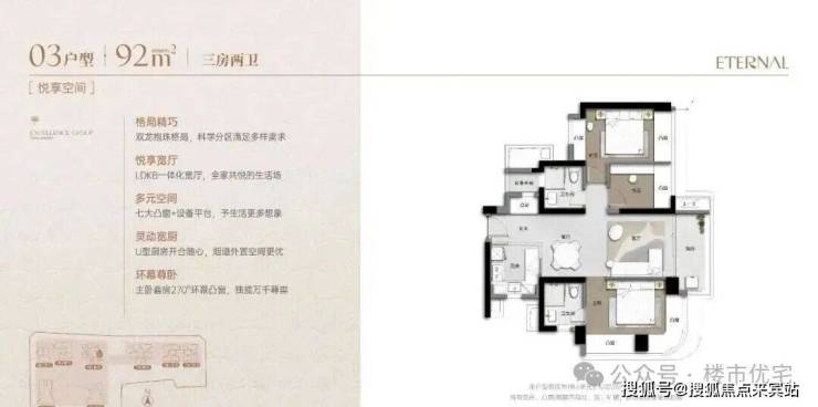 格局: 双套房设计、5.55米开间的宽厅、以及270°环幕凸窗的主卧,共同定义了何为“奢宅尺度”。近乎1梯1户的梯户比,更是将私密与尊贵推向极致。