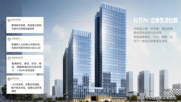 💎13万㎡立体社群-精英社交生活场打造多元化生活场,集精品商务公寓、写字楼、酒店、情景街区形成多元化布局,构建涵集居住、办公、社区于一体的城市立体垂直场。