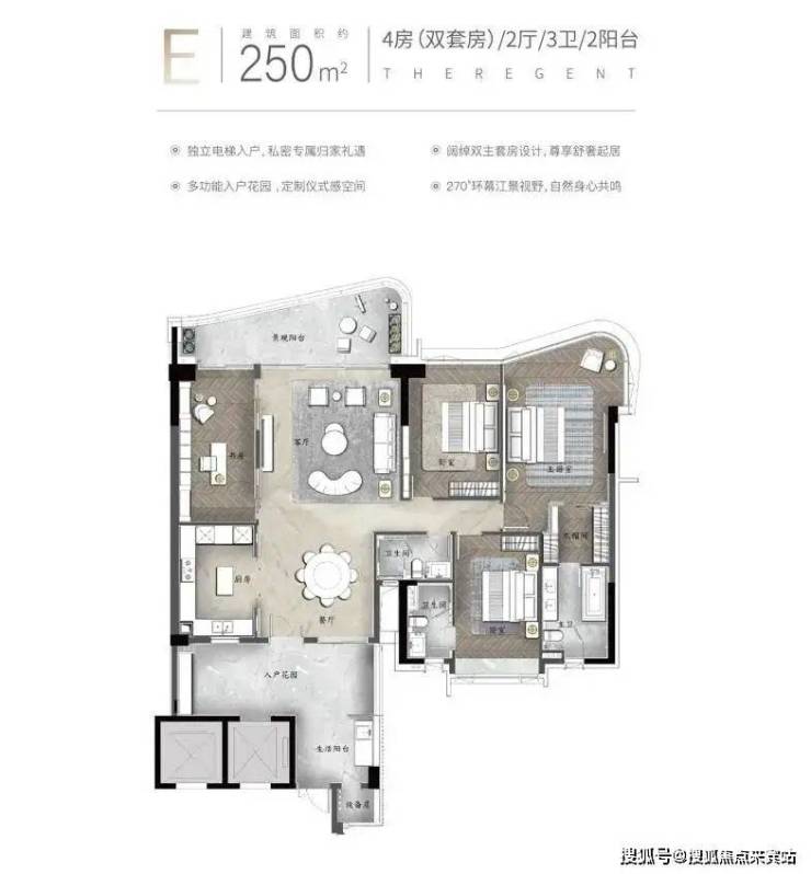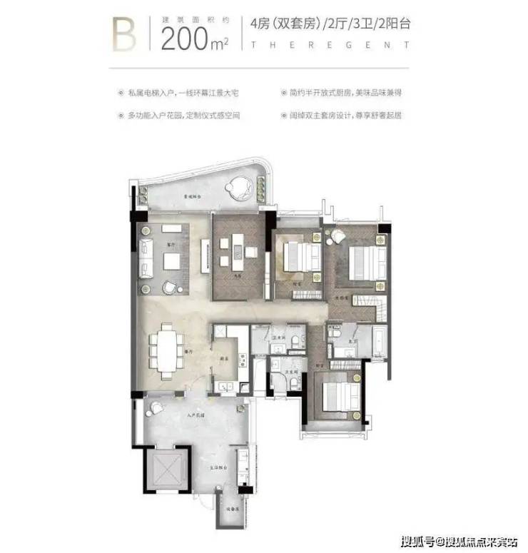 『天启』组团面积约140-250㎡环幕临江大平层,坐拥江景第一排,眺望小蛮腰,享500米宽阔无遮挡江景视野,并邀请三大全球知名设计大师倾力打造,并配备12大国际一线品牌交标,专梯专户四房双套房设计,世界灵感前沿作品礼献广州!