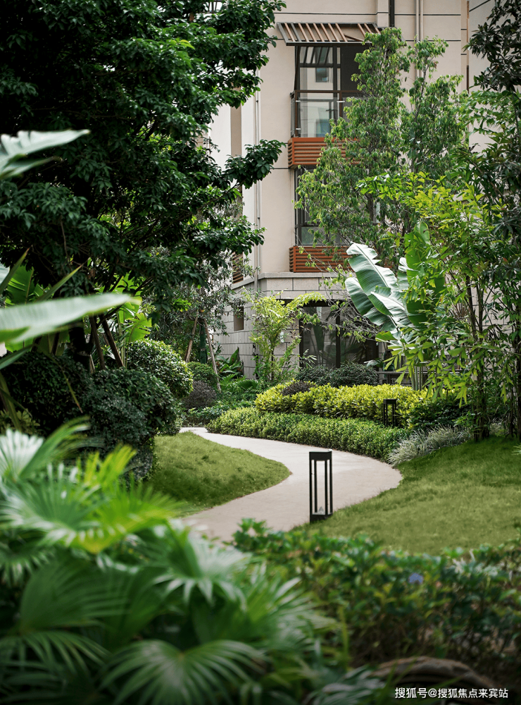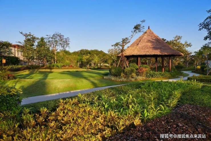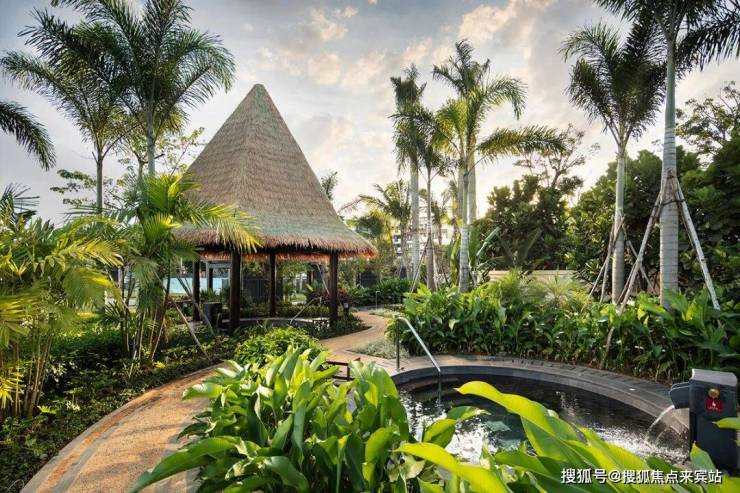 在东南亚风情园林中,融入椰子树、霸王棕、银海枣、火山石等海南当地特色自然元素,让海南的火山群地貌与热带雨林生态,真正地走进日常生活环境中。