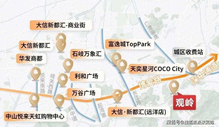 项目毗邻博爱路黄金中轴,对内如同鱼骨一般,一路深入串联中山城芯所有纵向路网,一网打尽远洋大信、富逸城TopPark、天奕COCOCITY、盛景尚峰、万象汇等各大顶级商圈。