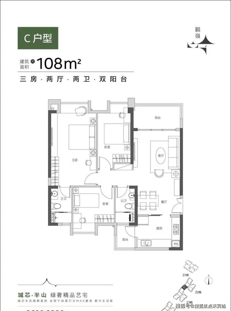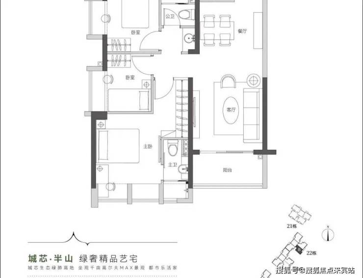 户型为双阳台设计,同样是客厅、主卧、次卧三开间朝高尔夫果岭,特别是景观阳台,270°环幕视野,放在中山新盘中,已然独一份。