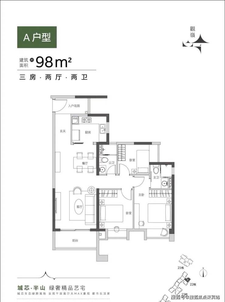 其中,建面约89/98平三房户型,均为三开间朝南,南望凯茵别墅群。