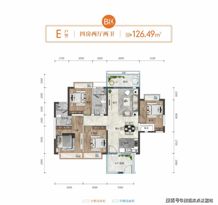 E户型:126平创享3+1房,南北通透阳光鲜氧,双厅一体纵享阔境排场