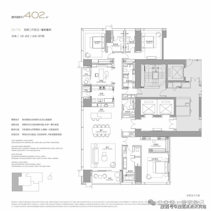 公寓主力户型为303㎡、326㎡、404㎡、572㎡等大平层,最大户型达1000㎡