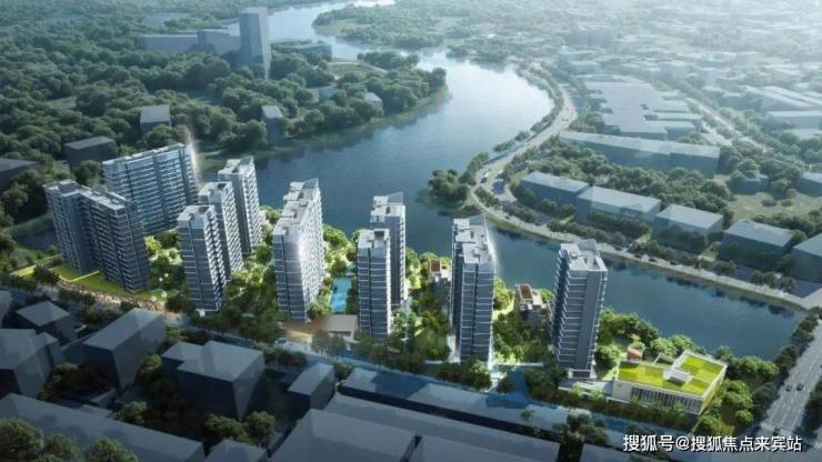 户型排布从石榴岗河自东向西依次升高,保证了约300米宽的生态水景面。