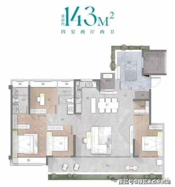 建面约143㎡平层奢宅:方厅+双厨设计,适合多人家庭欢聚