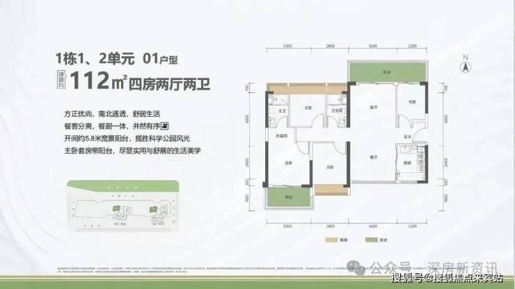112㎡的4房2厅2卫,1栋1/2单元01户型,设计的是竖厅南北通透格局,客厅3.6米开间,四开间朝南,主卧套房带阳台,客厅连接次卧出5.8米长的巨幕大阳台,阳台主朝东北向看科学公园。