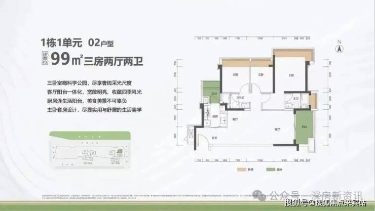 99㎡的3房2厅2卫,1栋1单元02户型,设计的是竖厅格局,客厅3.5米开间,进深11.31米,三卧室朝东北向看科学公园,厨房还带1个生活阳台,阳台1.5米进深,东南朝向。