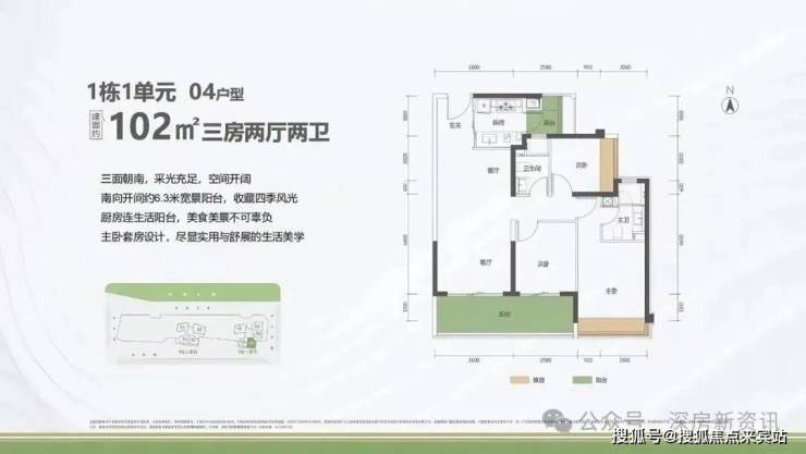 102㎡的3房2厅2卫,1栋1单元02户型,设计的是经典竖厅格局,客厅3.5米开间,三开间朝南,客厅连接次卧出6.3米长的巨幕大阳台,厨房还带1个生活阳台,西南朝向。