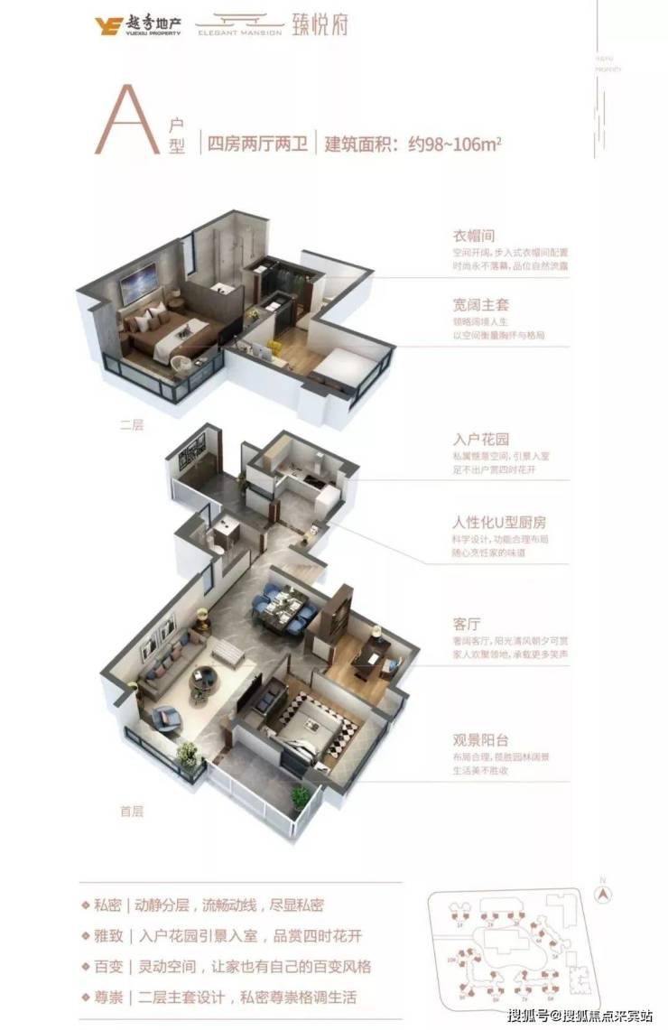 主力98-106平四房户型,其特别之处还在于,有阳光客厅和独立阳台,此外,还有9平米超大入户花园,空间设计别出心裁