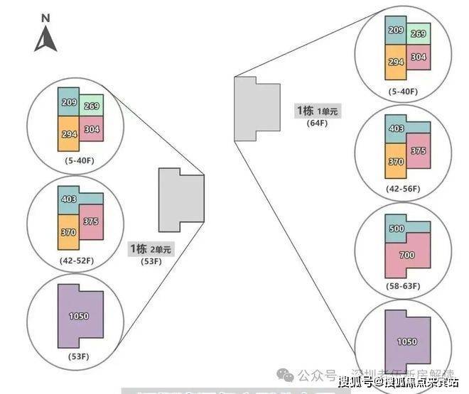 1栋公寓250米,4栋住宅分别150米、200米、200米、240米。层高3.3米,约40-70层(不含底商)。