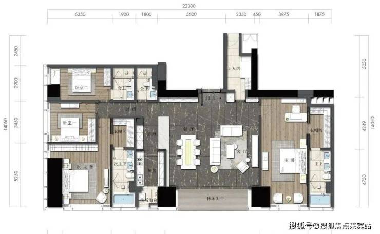建筑面积约223平方米:三房两厅三卫布局
