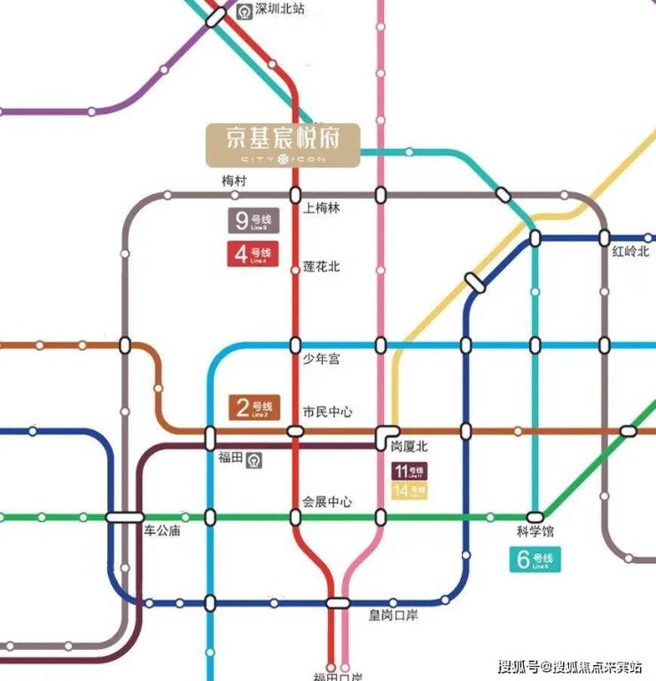 双地铁口,4/9号线上梅林站400米,3站市民中心,2站香蜜湖。在建22号线。北环大道、新洲路、彩田路"一横两纵"。福田高铁站4站到香港西九龙,皇岗口岸福田口岸。