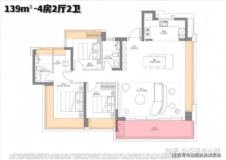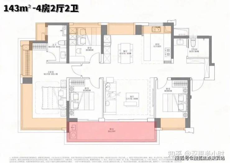 143m²的4房2厅2卫,设计的是竖厅南北通透格局,进门入户玄关,客厅4.5米开间,餐客厅分离设计,四开间朝南,全屋七面飘窗,主卧大套间做到了270度转角无柱飘窗,U型厨房,公卫三段式干湿分离,得房率约92.2%(包含赠送),客厅连接次卧出7.4米长的观景大阳台,全部主朝东南向,看大运中心+大运公园景观。