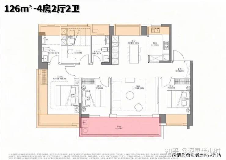 126m²的4房2厅2卫,设计的是竖厅南北通透格局,进门入户玄关,客厅4.3米开间,餐客厅分离设计,四开间朝南,全屋八面飘窗,主卧做到了270度转角无柱飘窗,U型厨房,卫生间干湿分离,得房率约95.2%(包含赠送),客厅连接次卧出7.1米长的观景大阳台,全部主朝西南向,看大运公园景观。
