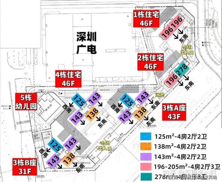 总规划605户,全部都是商品房,规划有126-139-143平的4房2卫,197-206-282平的4房3卫户型,做到了户户朝南向,3栋A/B座跟4栋是3梯4户,1/2栋2梯2户设计,地下室有3层,总规划车位1046个,其中带充电桩车位314个,车位占比约1:1.73。