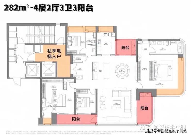 282m²的4房2厅3卫3阳台,设计的是竖厅格局,客厅6.2米开间,LDKB大方厅设计,2梯2户,尊享专梯专户,私享超大入户公区,五开间朝南,主卧270°无柱转角飘窗,双套房设计均配置衣帽间,中西双厨房,主卫配置浴缸,得房率约90.6%(包含赠送),不含电梯入户,南北双阳台,小阳台看大运公园山景,大阳台东南朝向,俯瞰整个大运中心。