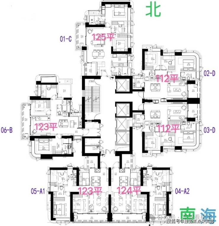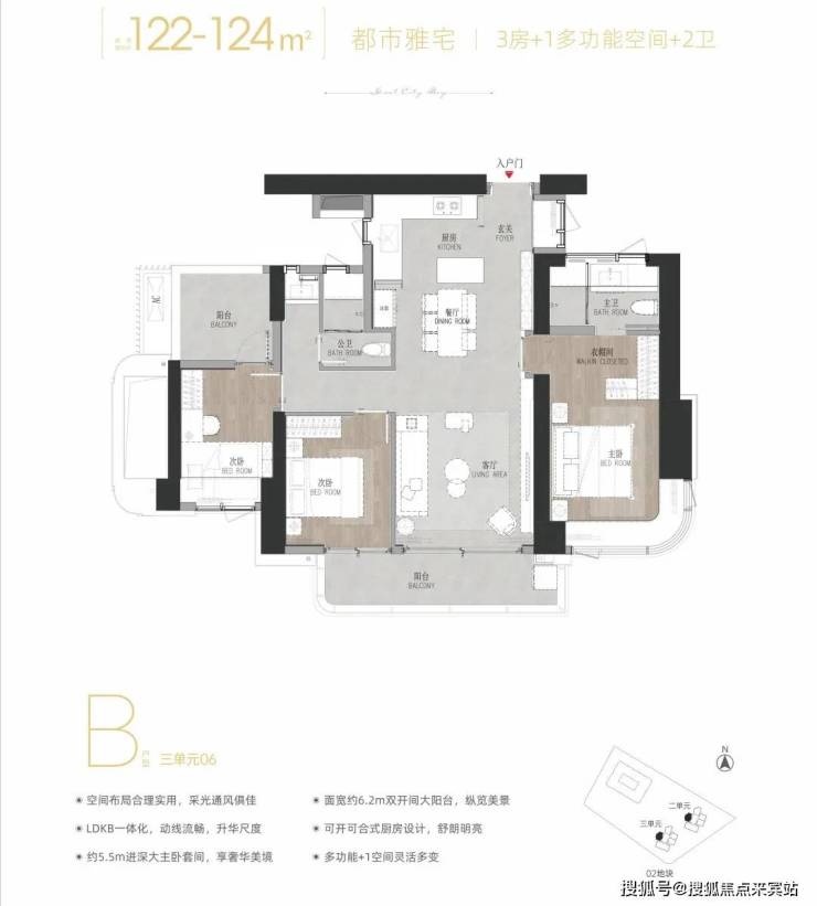 06 B户型——建面约122-124㎡3+1多功能空间:双龙抱珠户型,次卧带阳台。西北朝向看绿地公园及花园。虽然是125㎡户型中总价最低的,但仍保持高标准的空间尺度和配置,适合注重实用性的改善家庭,属于性价比之王。