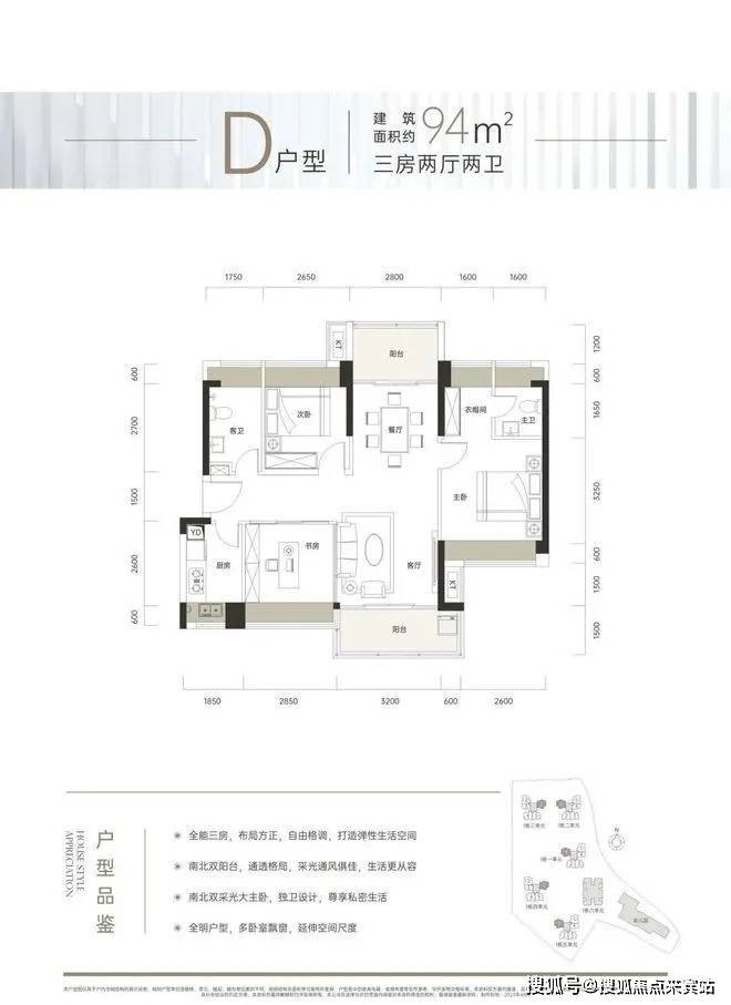 建面约94㎡的户型同样是3房2厅2卫,空间更加阔绰。南北通透,采光通风俱佳。主卧不仅有飘窗延伸空间,还预留了独立的衣帽空间,而且带独立卫生间,双向采光,舒适度更高。