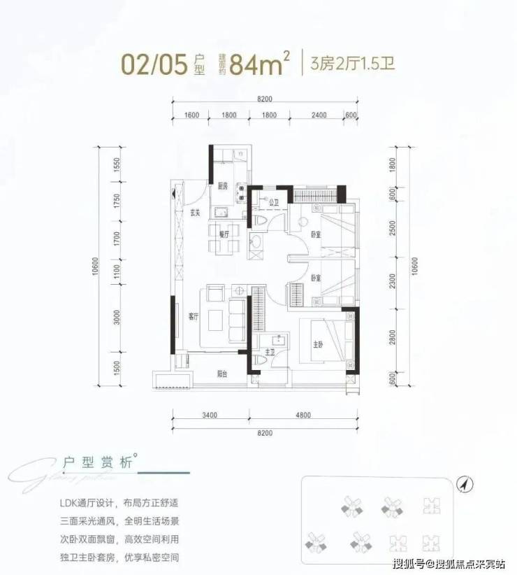 推出建面约84㎡三房两厅两卫,约98㎡三房两厅两卫,约114㎡四房两厅两卫,约128㎡四房两厅两卫,共计4个面积段产品。