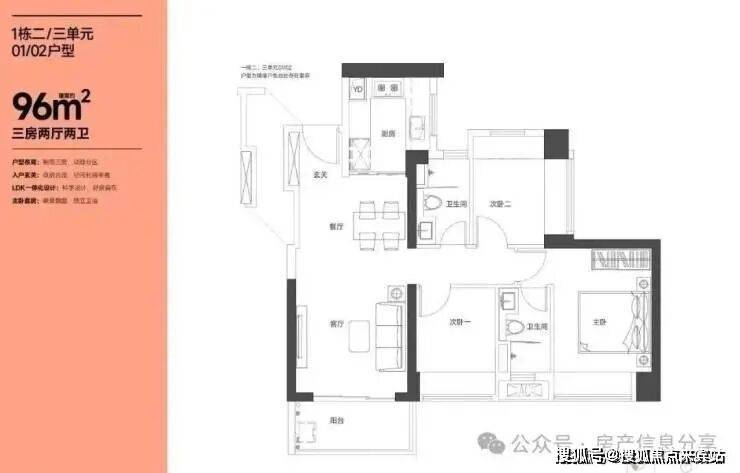 95㎡的3房2厅2卫,设计的是竖厅格局,LKDB一体化设计,进门入户玄关,有1个次卧做的双飘窗,U型厨房,卫生间三段式分离,得房率:74.34%(不含赠送),全部东南朝向。